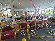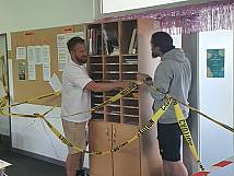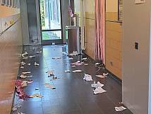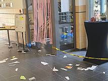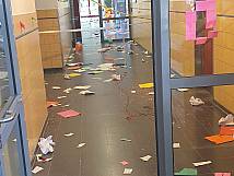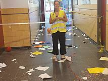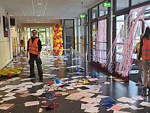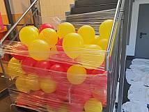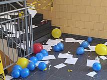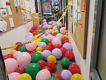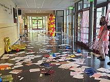 Im Schulgebäude setzte sich die kreative Verwandlung fort: Überall hingen Luftballons und Absperrbänder – nicht nur im Foyer, sondern quer durch alle Klassenzimmer. Selbst das Lehrerzimmer blieb nicht verschont. Es wurde symbolisch „abgesperrt“, sodass die Lehrkräfte sich zu ihren Plätzen durchkämpfen mussten, mit vielen Luftballons dekoriert und zum Schrecken einiger Lehrkräfte war ein wichtiges Gerät im Lehreralltag verschwunden: die Kaffeemaschine.