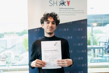 Kurz vor dem Ende des Schuljahres kamen endlich die langersehnten Ergebnisse an: 4 Schüler*innen ist es gelungen, das Deutsche Sprachdiplom auf dem Niveau B1 zu erreichen, weitere 4 haben das Niveau A2 erfolgreich absolviert. Ein besonderer Grund zur Freude ist, dass zwei Schüler der KGS Reinfeld zu den besten Absolventen des Landes Schleswig-Holstein gehören und somit gemeinsam mit ihrem Lehrer Herrn Kühn zur feierlichen Übergabe der Diplome in das Restaurant Längengrad in Kiel eingeladen wurden. Diese Feierlichkeit fand nachmittags am 19.09.22 statt und wurde mit zahlreichen Rede- und Musikbeiträgen sowie einem reichhaltigen Buffet begangen. Sowohl die Schüler als auch Herr Kühn genossen die Veranstaltung im vollen Zügen. Herzlichen Glückwunsch!