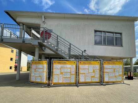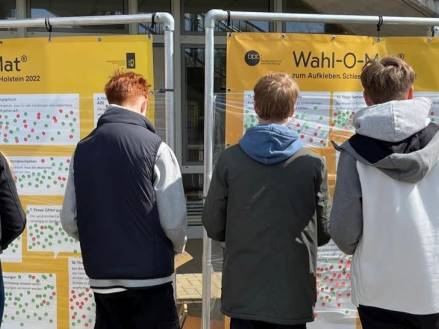 Miteinander ins Gespräch kommen über die Landtagswahl 2022 auf dem Schulhof. Dies war am Mittwoch, 04.05., dank des „Wahl-O-Mats zum Aufkleben“ möglich. Auf dem Schulhof standen Stellwände mit 38 Thesen zur Landtagswahl. Die Schüler und Schülerinnen konnten gemeinsam über die Thesen diskutieren und mit Klebepunkten abstimmen. Am Ende bekamen sie ein Ergebnis ausgedruckt, das durch ein Lochkartensystem ermittelt wurde. Begleitet wurde der „Wahl-O-Mat zum Aufkleben“ von drei Teamerinnen und Teamer vom Landesbeauftragten für politische Bildung Schleswig-Holstein.