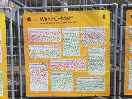 Der „Wahl-O-Mat zum Aufkleben“ ist in den Wochen vor der Landtagswahl 2022 auf Tour in Schleswig-Holstein. Das Projekt wird von der Landesbeauftragten für politische Bildung Schleswig-Holstein durchgeführt.
