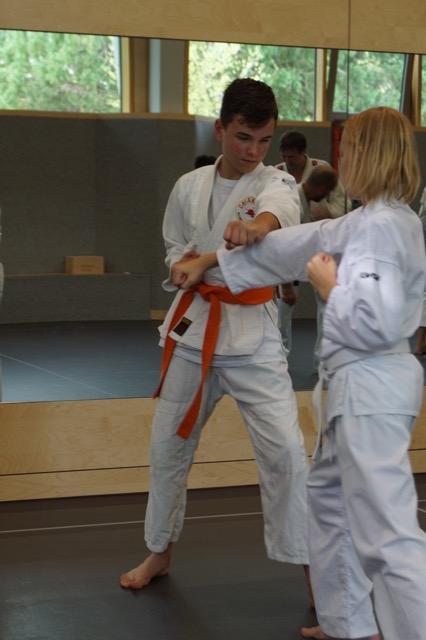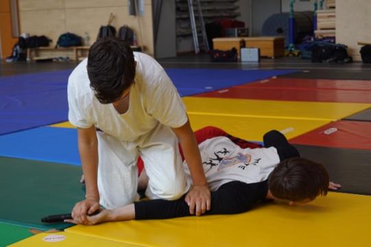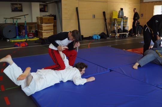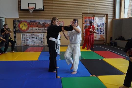 Der Freitag startete früh mit einer eineinhalb stündigen Joggingrunde, die Alessandro später noch am Tag in den Knochen gesteckt hat. Nach einer morgendlichen Stärkung wurde Freiburg mit einer kurzen Sightseeing-Tour unsicher gemacht. Gegen Mittag startete der Lehrgang zunächst mit dem Aufbau. Anschließend standen schon die ersten drei Stunden Training des Bundeszentrallehrgangs an. Alessandro und Malte versuchten sich hier beim Jiu-Jitsu an Befreiungen aus Würgegriffen.