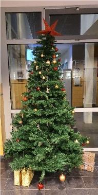 Man sieht auch in 2022 wieder im Schulgebäude, dass Weihnachten vor der Tür steht. Traditionell steht bei uns der schön leuchtende Weihnachtsbaum im Flur und auch alle anderen Flure und Treppen sind weihnachtlich geschmückt.